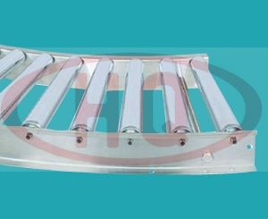 該型輸送機為90度弧形轉(zhuǎn)彎輸送機,使用不銹鋼錐型滾筒,適用于輸送機的轉(zhuǎn)彎連接、有防銹要求的場合。