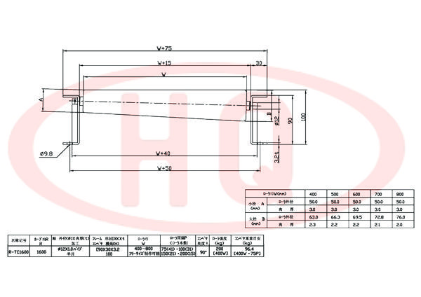 | R-TC1,600 | 小徑 A (mm) | 滾 筒 外 徑 | 50.0 | 50.0 | 50.0 | 50.0 | 50.0 | |