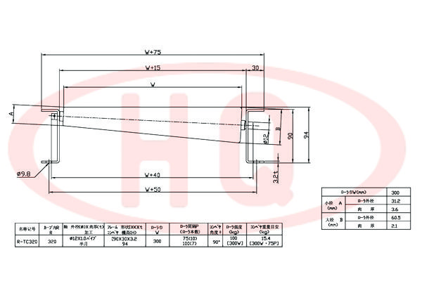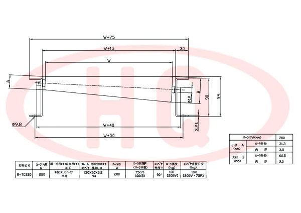 | 型 號 | 轉(zhuǎn)彎半徑 R | 軸外徑(φ)×壁厚(t) 加工 | 支架形狀I×K×t 輸送機高(H) | 滾筒幅寬 W | 滾筒間距 P (滾筒數(shù)) | 輸送機 角度 θ | 滾筒強度 (kg) | 輸送機重量 (kg) | ||||